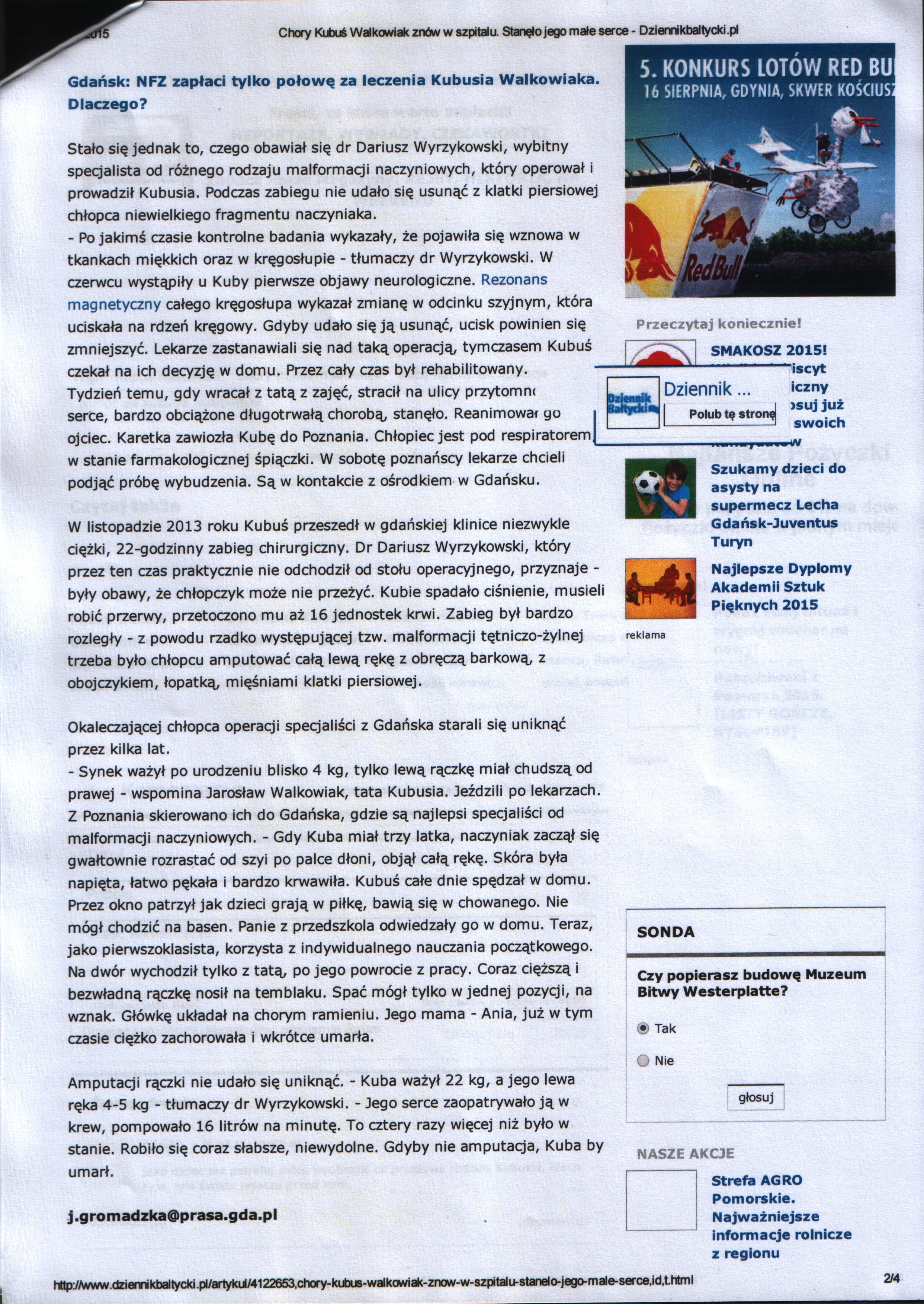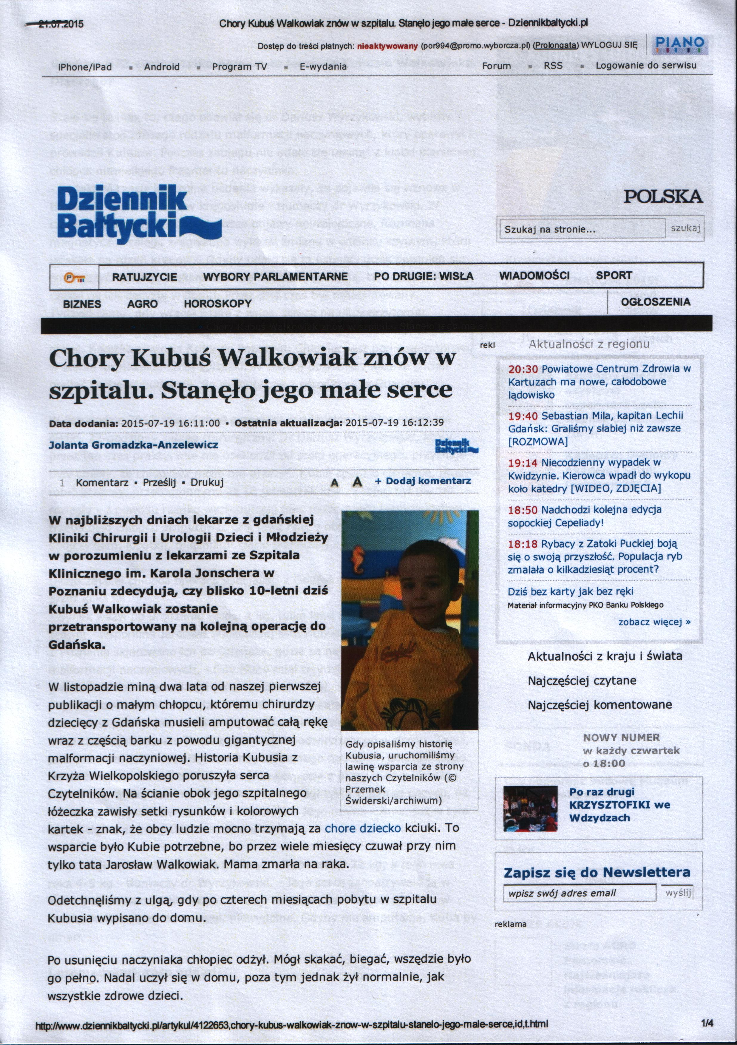 Znany już chłopiec Jakub Walkowiak, pacjent naszej Kliniki, znowu znajduje się w Szpitalu...